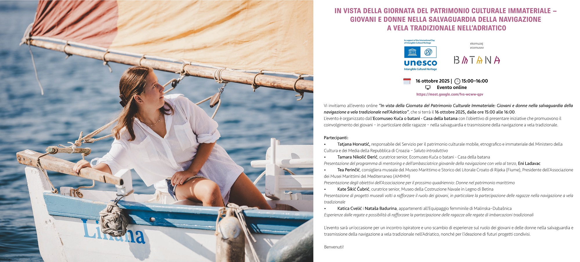 Vi invitiamo all’evento online “In vista della Giornata del Patrimonio Culturale Immateriale: Giovani e donne nella salvaguardia della navigazione a vela tradizionale nell’Adriatico”, che si terrà il 16 ottobre 2025, dalle ore 15:00 alle 16:00 al seguente link: https://meet.google.com/fvs-wcww-qpv.